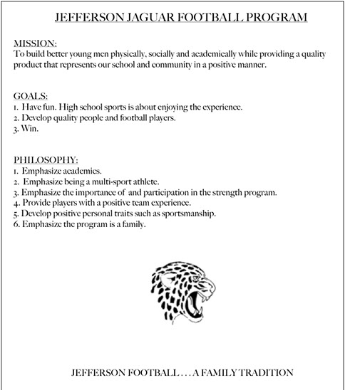LEADERSHIP: As soon as you put on a Jefferson Football jersey you become a leader. You lead by example, both on the field and off. You are in the public limelight, take pride in that fact and act accordingly.